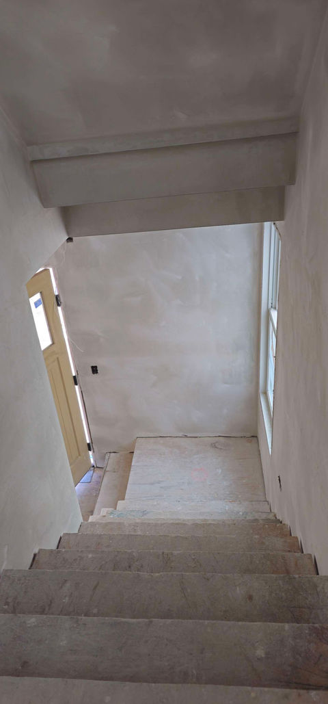 An application of plaster to seams, beads, joints and corners, then a flat layer of plaster over everything to cover, and finnaly a light and flat skip finish.